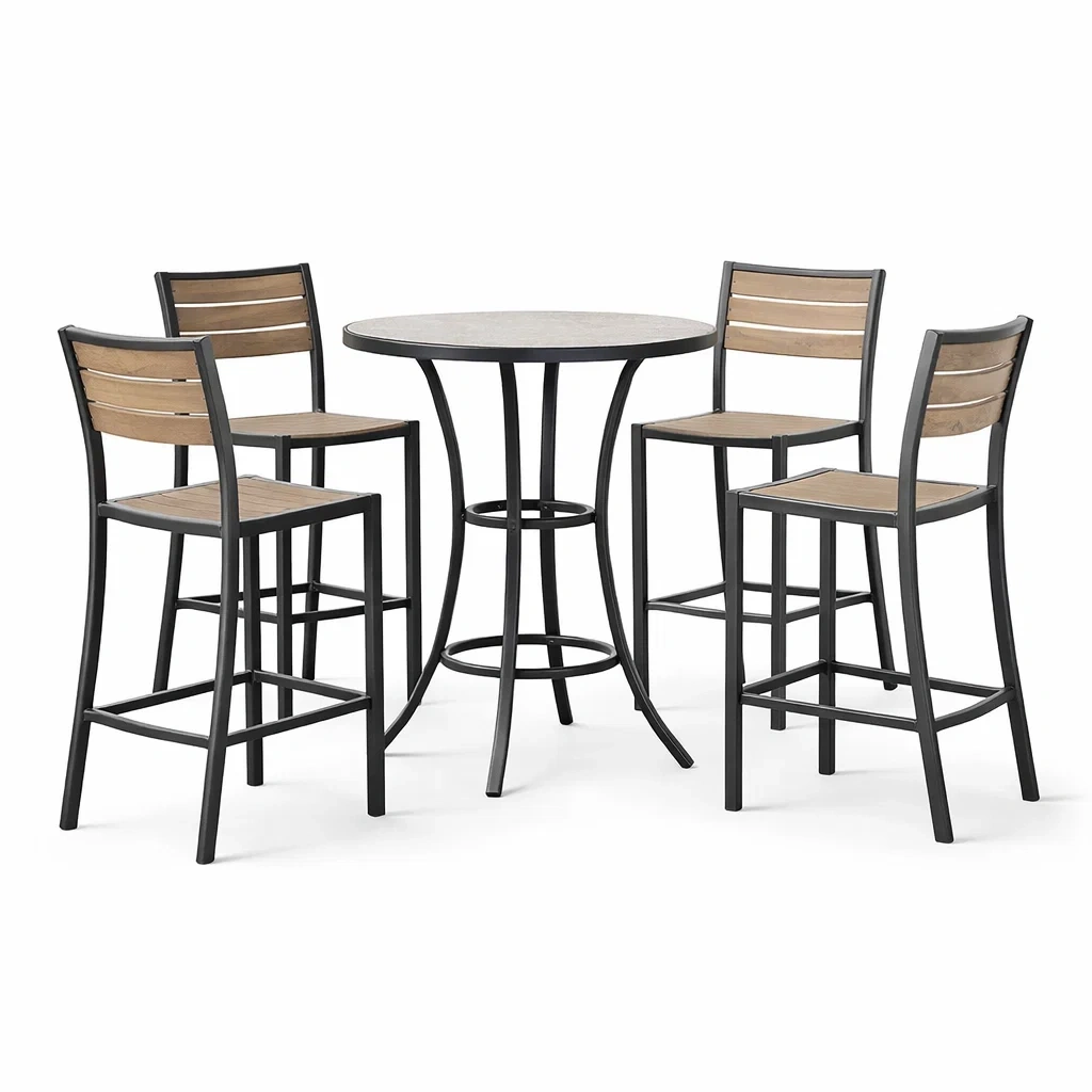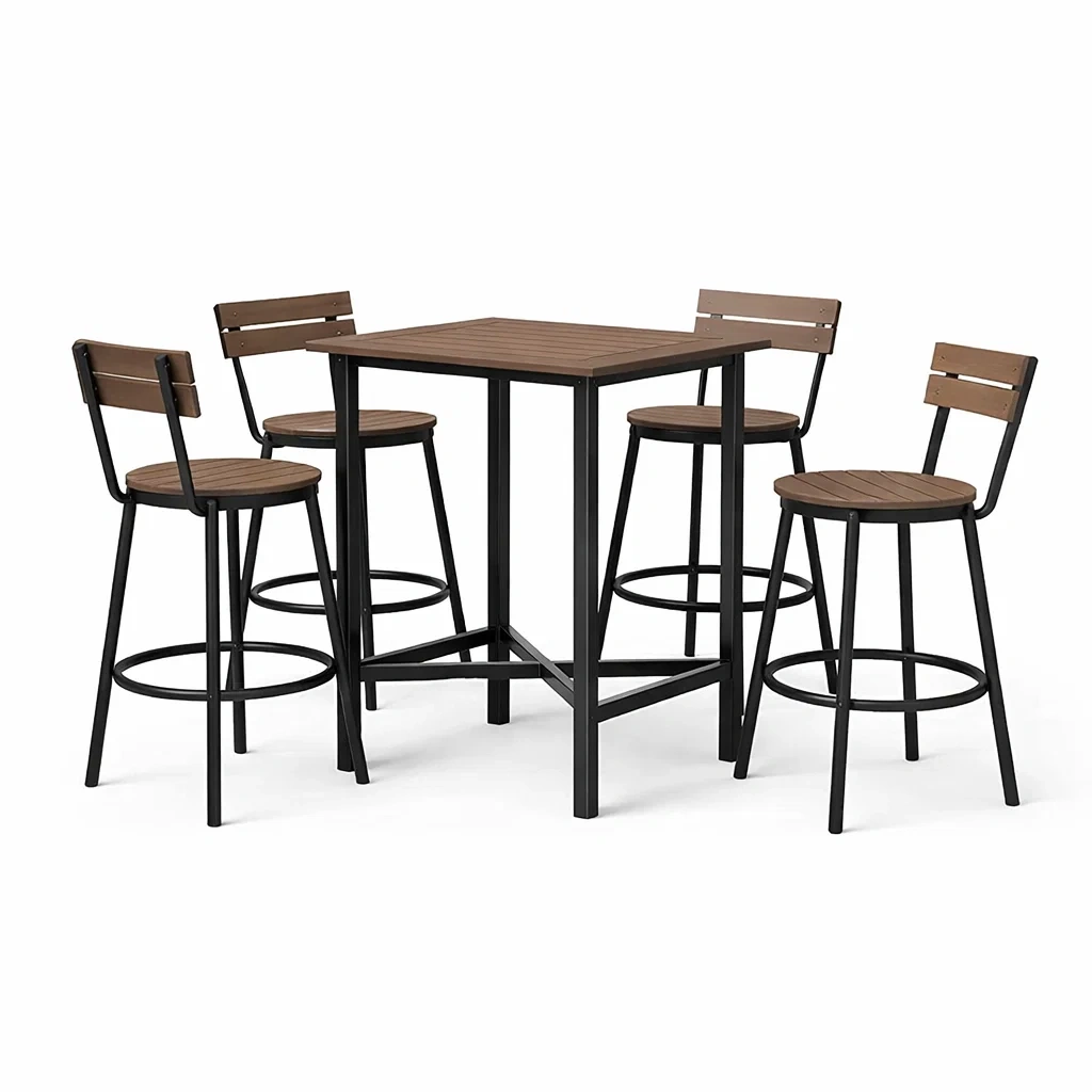 Ensemble de bar avec table haute et chaises en bois et métal noir