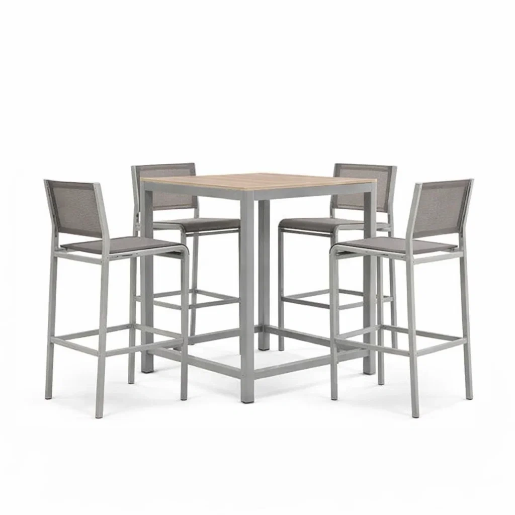 Ensemble de bar en aluminium et bois gris avec table et chaises hautes