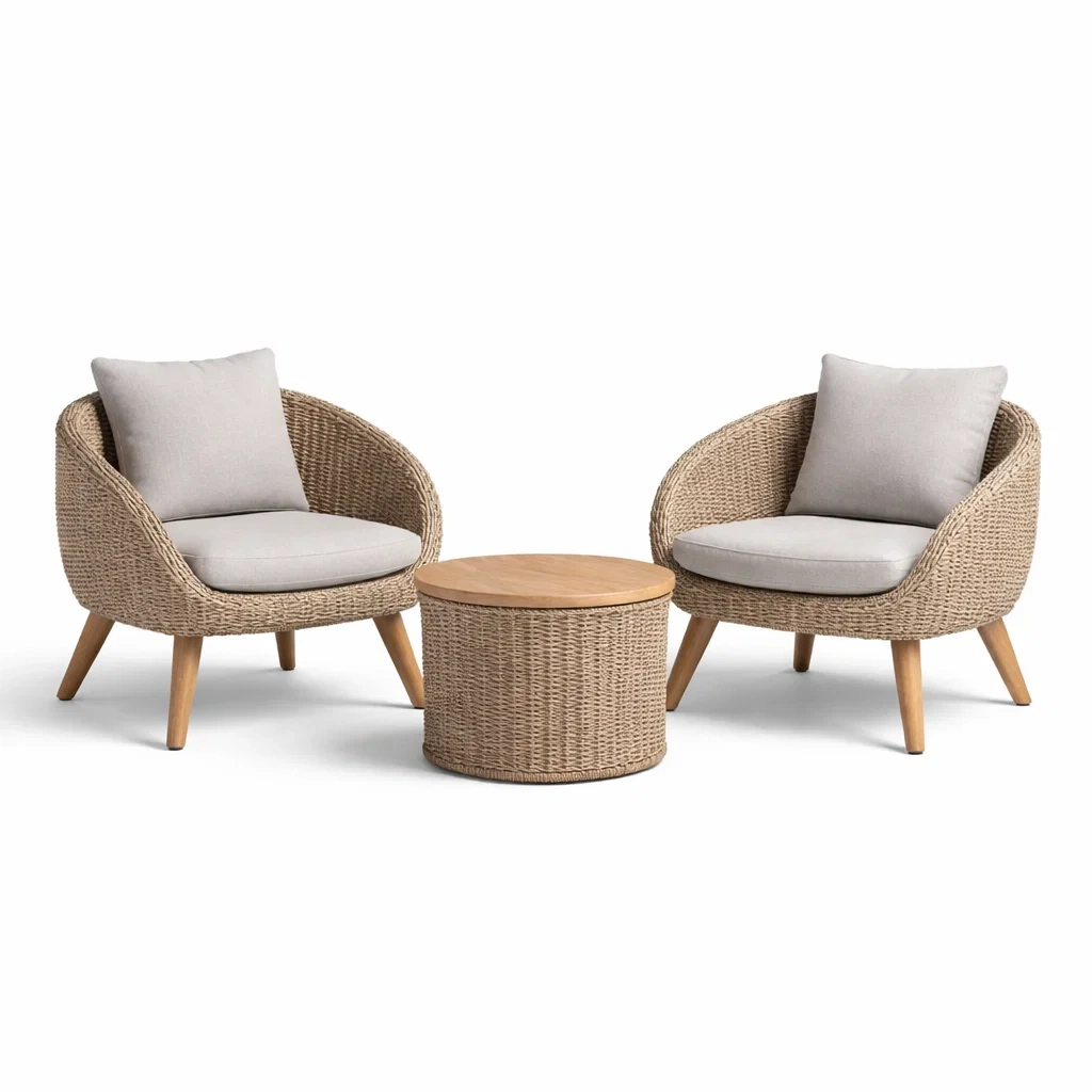 Ensemble de détente avec fauteuils en rotin et table basse en bois beige et gris