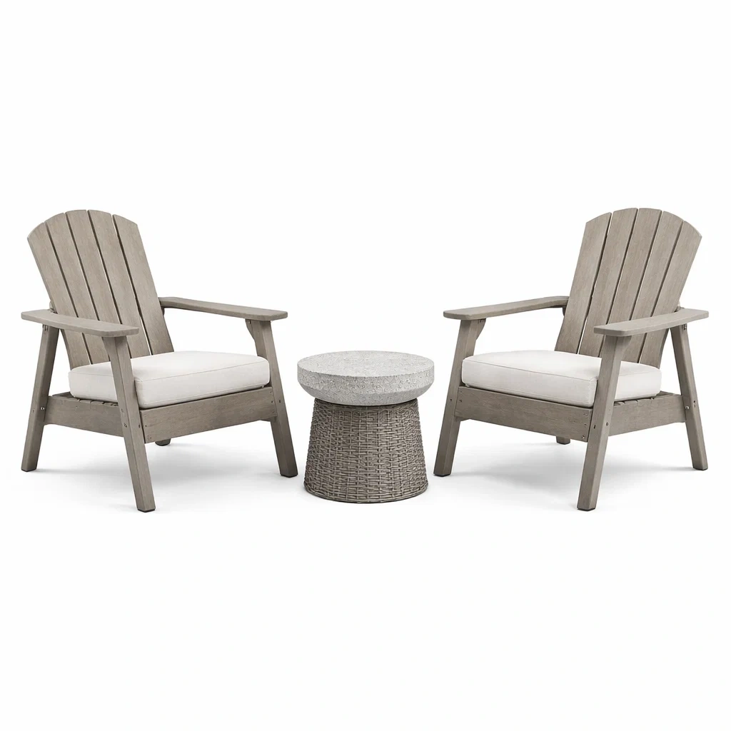Ensemble de détente avec chaises en bois et table en béton et coussins