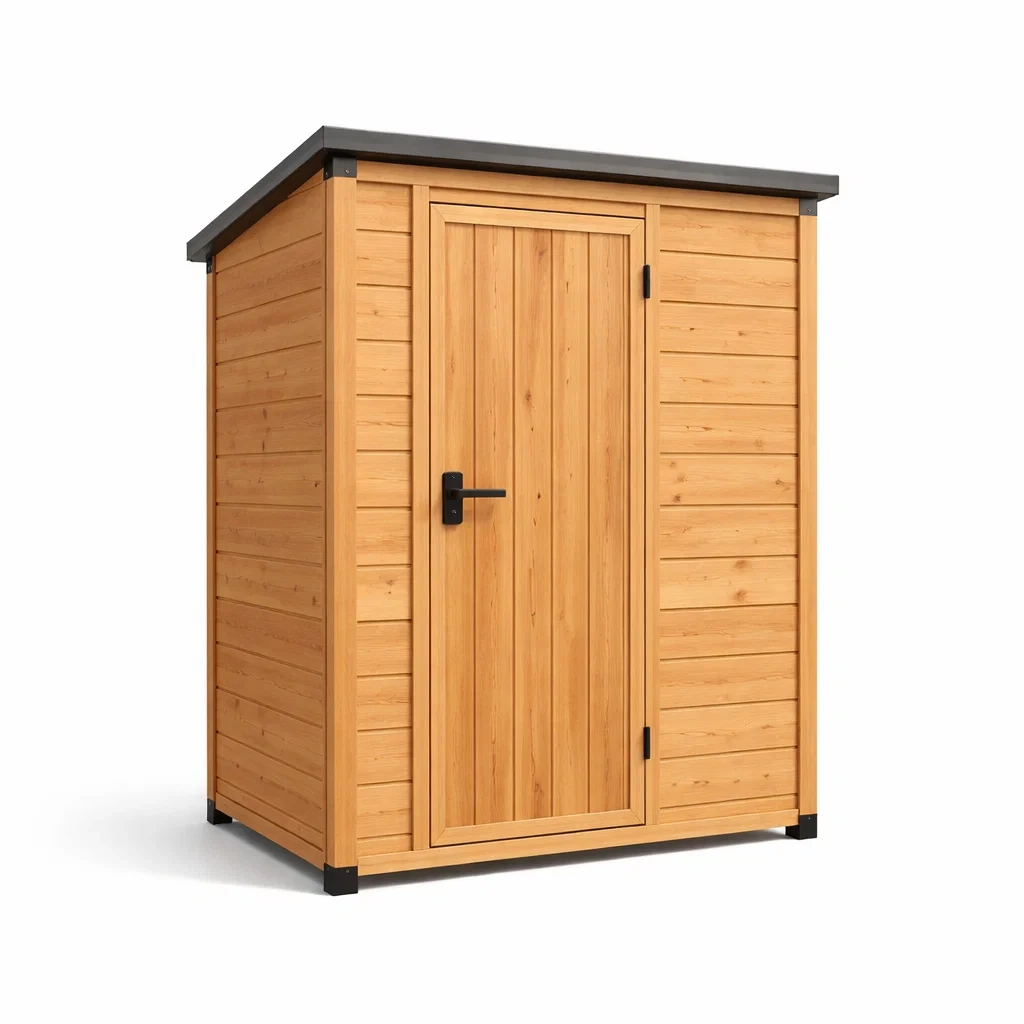 Abri de jardin en panneaux de bois lamellé-collé avec un toit incliné conçu pour une utilisation en extérieur.