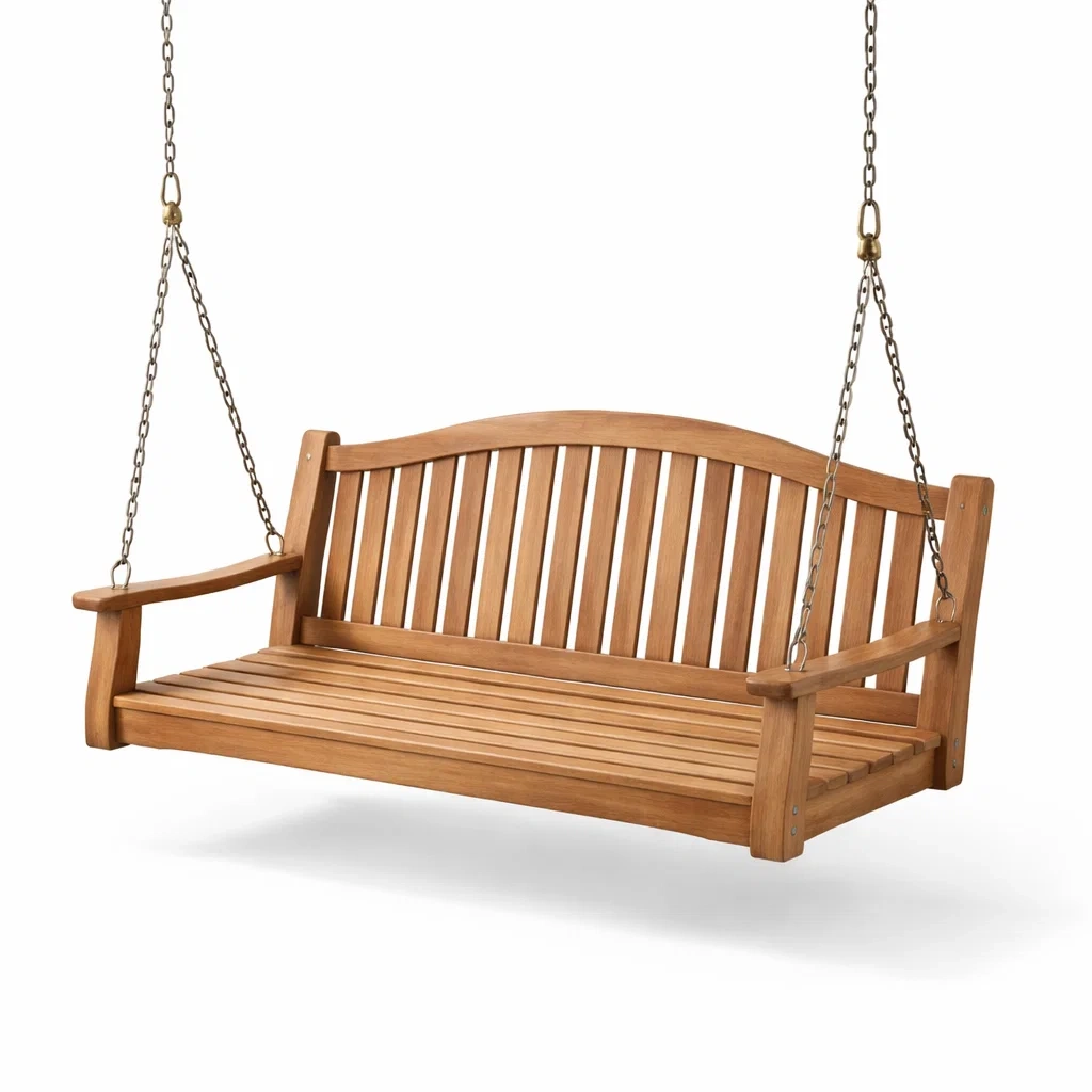 Cette balançoire de jardin est fabriquée en bois de teck massif, offrant robustesse et durabilité.
