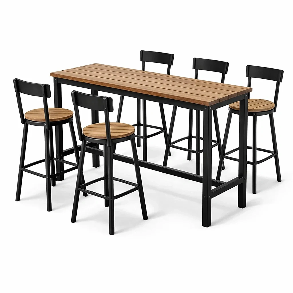 Ce lot se compose d'une table haute et de six chaises. La table et les chaises ont des plateaux et assises en bois d'acacia, tandis que la structure est en métal pour garantir stabilité et durabilité. Le poids total supporté par chaque chaise est de 100 kg.