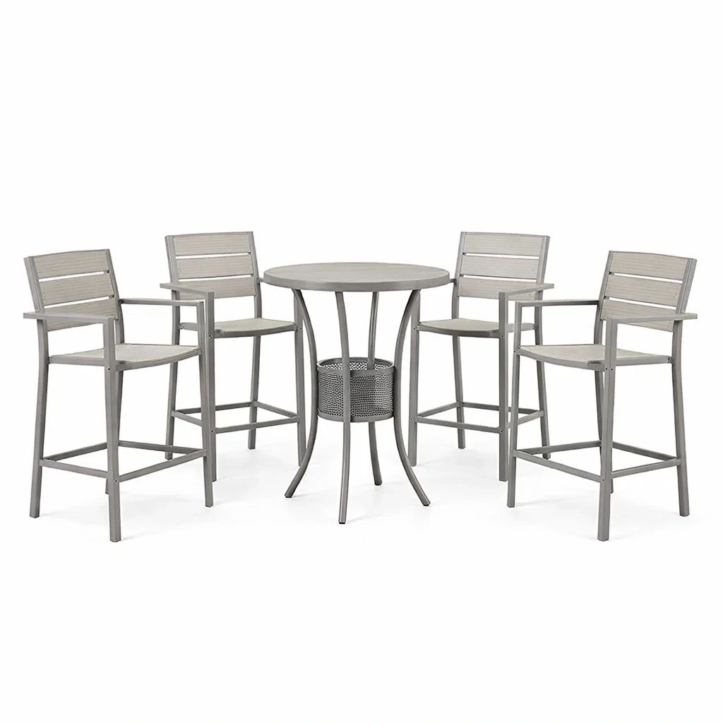 Ensemble de mobilier comprenant une table ronde et quatre chaises hautes. La table et les chaises sont fabriquées en aluminium résistant avec plateaux et assises en bois composite, idéal pour une utilisation en extérieur. Les dimensions de la table sont diamètre 80 cm et hauteur 110 cm, tandis que les chaises mesurent 100 cm de hauteur, 50 cm de largeur et 45 cm de profondeur. Chaque chaise peut supporter jusqu'à 120 kg. Cet ensemble est conçu pour résister aux intempéries. Nettoyage facile avec un chiffon humide.