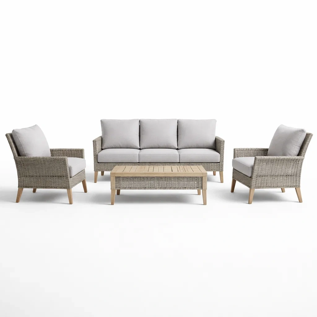 Matériau: Structure en aluminium, rotin synthétique en polypropylène, coussins en tissu polyester, table en bois d'acacia.