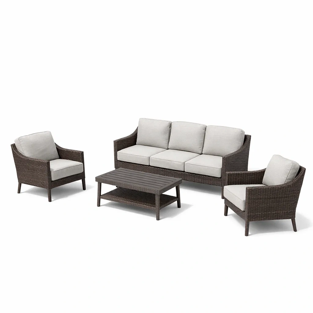 Structure en acier avec résine tressée synthétique; coussins en tissu polyester.