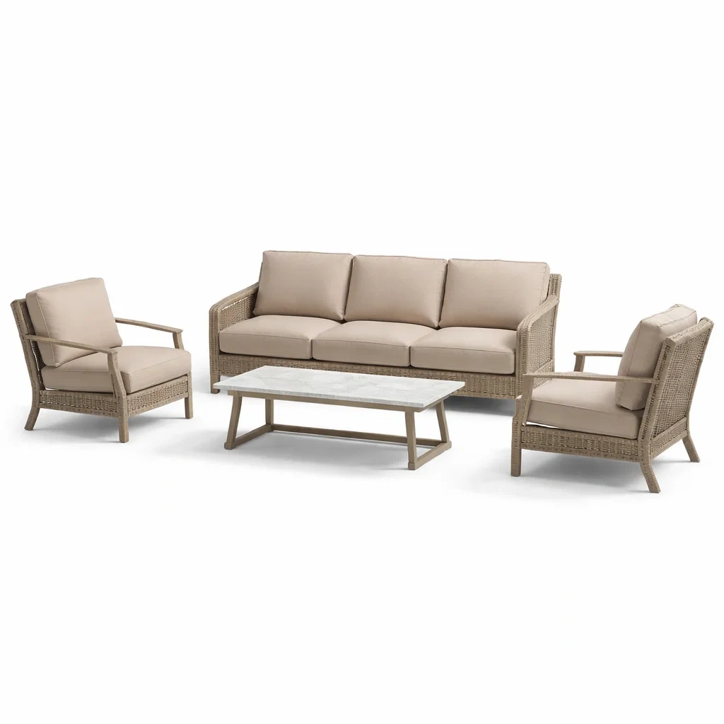 Ensemble comprenant un canapé trois places, deux fauteuils et une table basse. La structure est en aluminium avec un revêtement en rotin synthétique, et la surface de la table est en pierre composite. Les coussins sont rembourrés avec une mousse haute densité. Dimensions : Canapé (L 200 x P 85 x H 75 cm), Fauteuils (L 75 x P 85 x H 75 cm), Table basse (L 120 x l 60 x H 45 cm). Utilisation extérieure. Poids total de l'ensemble : environ 55 kg. Entretien simple avec un chiffon doux et de l'eau savonneuse.