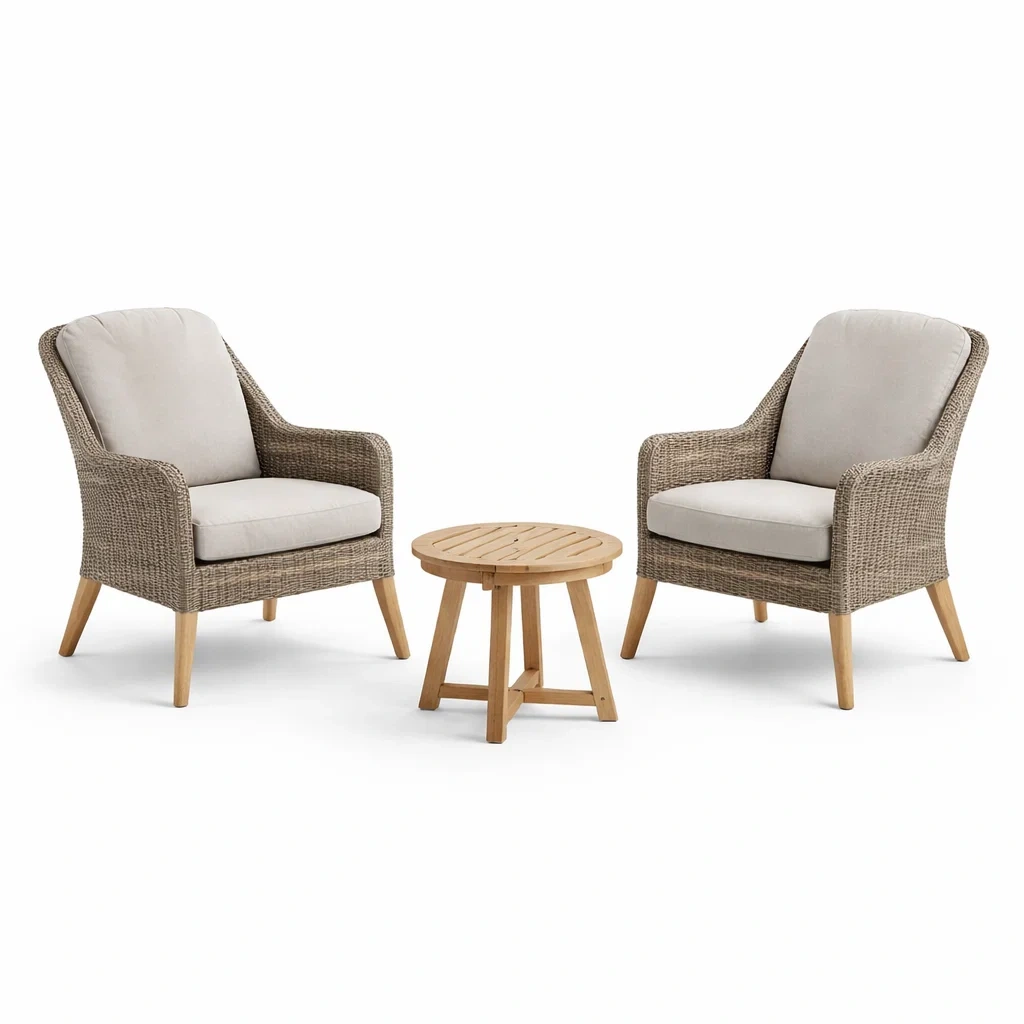 Matériaux : Fauteuils en résine tressée avec pieds en bois, coussins en polyester ; Table en bois massif.