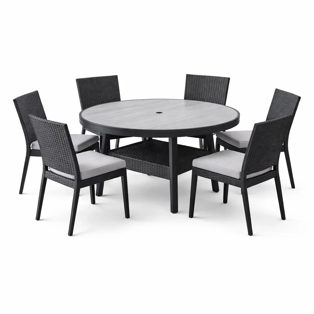 Ensemble table et chaises en métal et bois avec assises en résine tressée