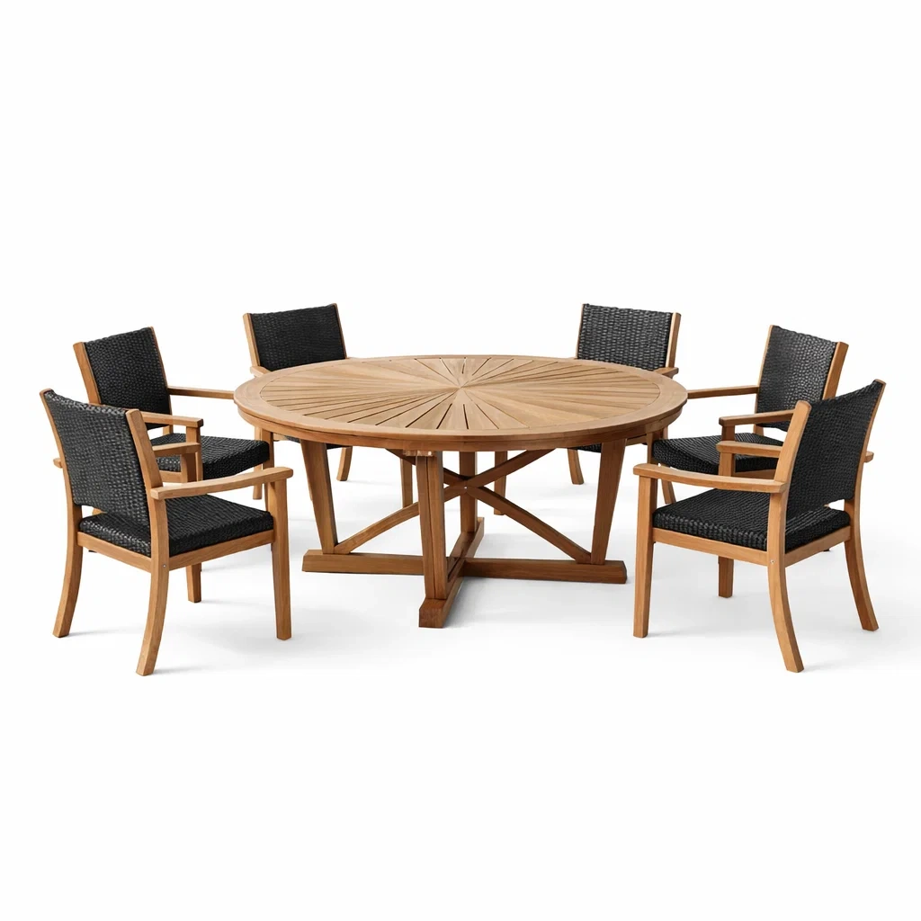 Matériau: Table en teck; Chaises avec structure en teck et assise et dossier en osier synthétique.