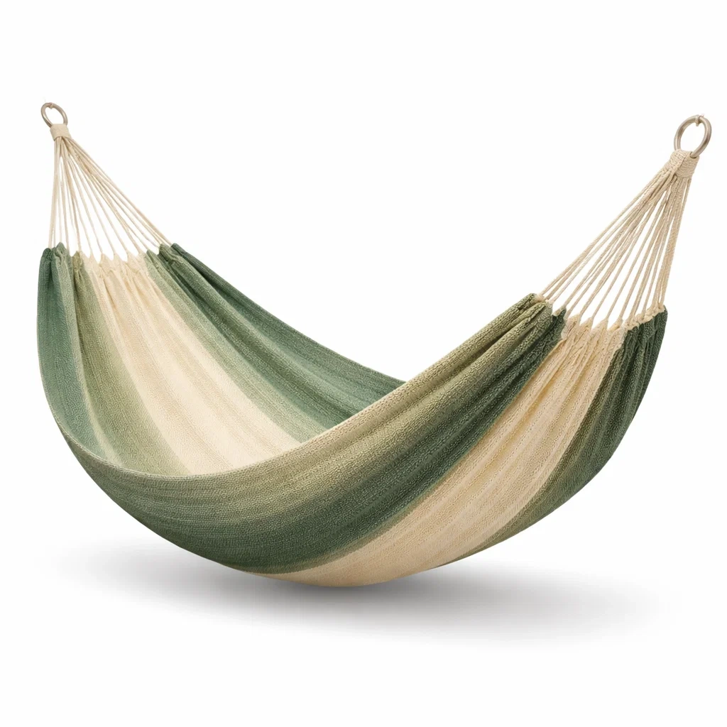 Hamac en coton épais composé de 65% coton et 35% polyester, avec des rayures dégradées vertes et beiges. Dimensions: longueur 200 cm, largeur 150 cm. Conçu pour une utilisation extérieure, avec une capacité de charge jusqu'à 150 kg. Anneaux de suspension inclus. Lavage à la main recommandé, séchage à l'air libre.