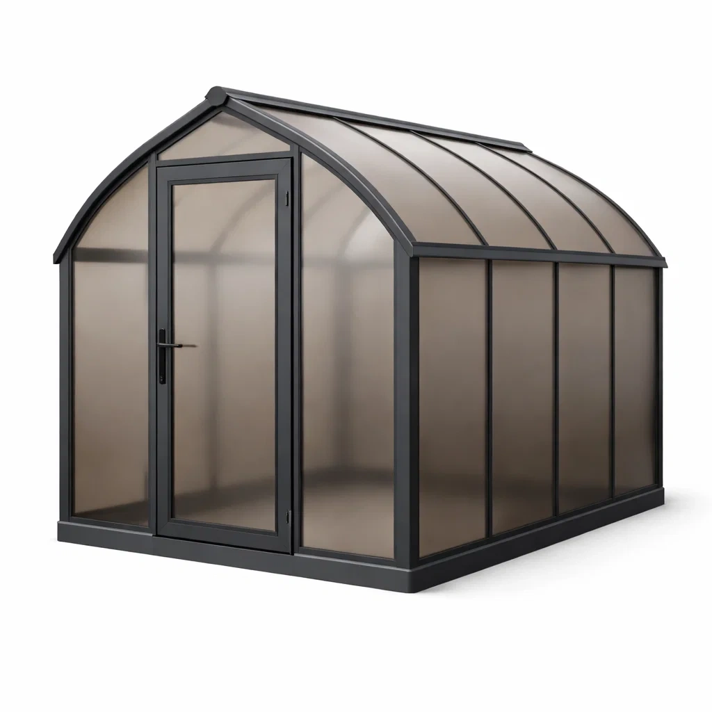 Matériaux : Cadre en aluminium, panneaux en polycarbonate brun résistant aux intempéries